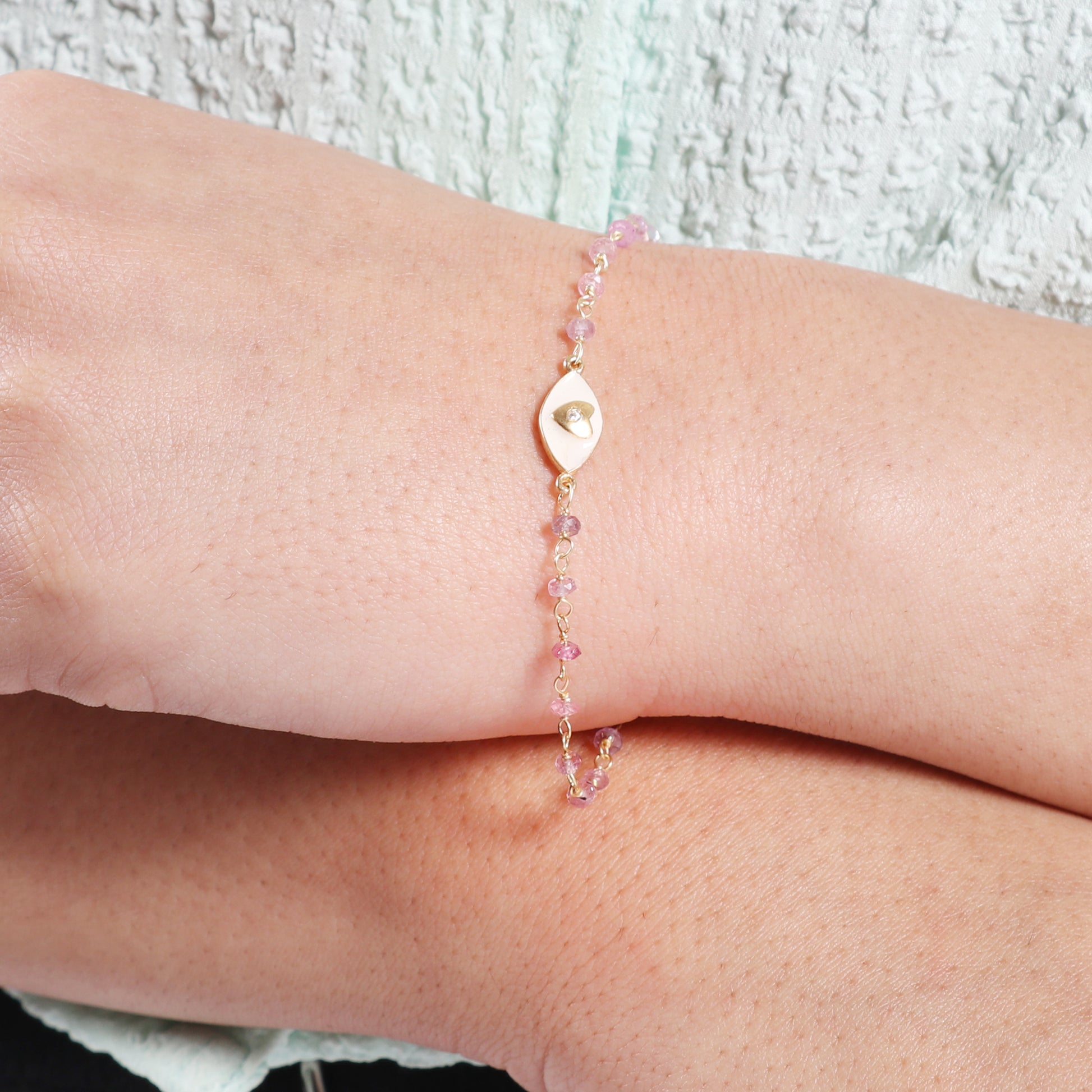 Indulge in elegance with our Pink Tourmaline heart charm rosary bracelet. The gold plated 925 sterling silver beautifully enhances the delicate white enamel and sparkling zircon stone. With the added benefits of pink Tourmaline, known for promoting love and balance, this bracelet is sure to elevate any outfit.