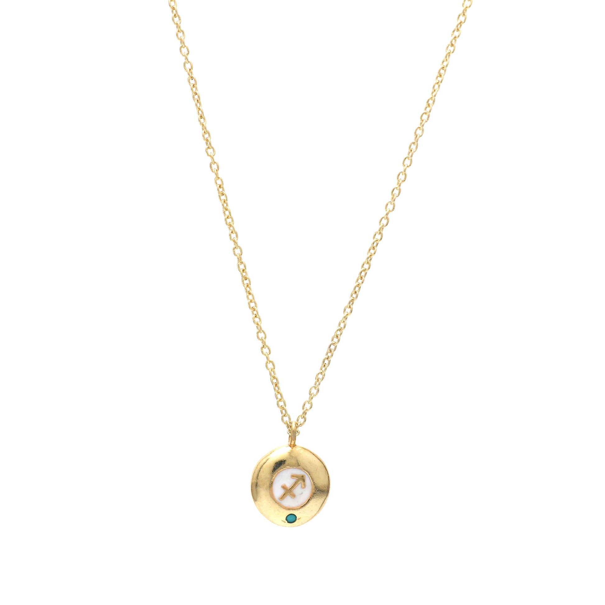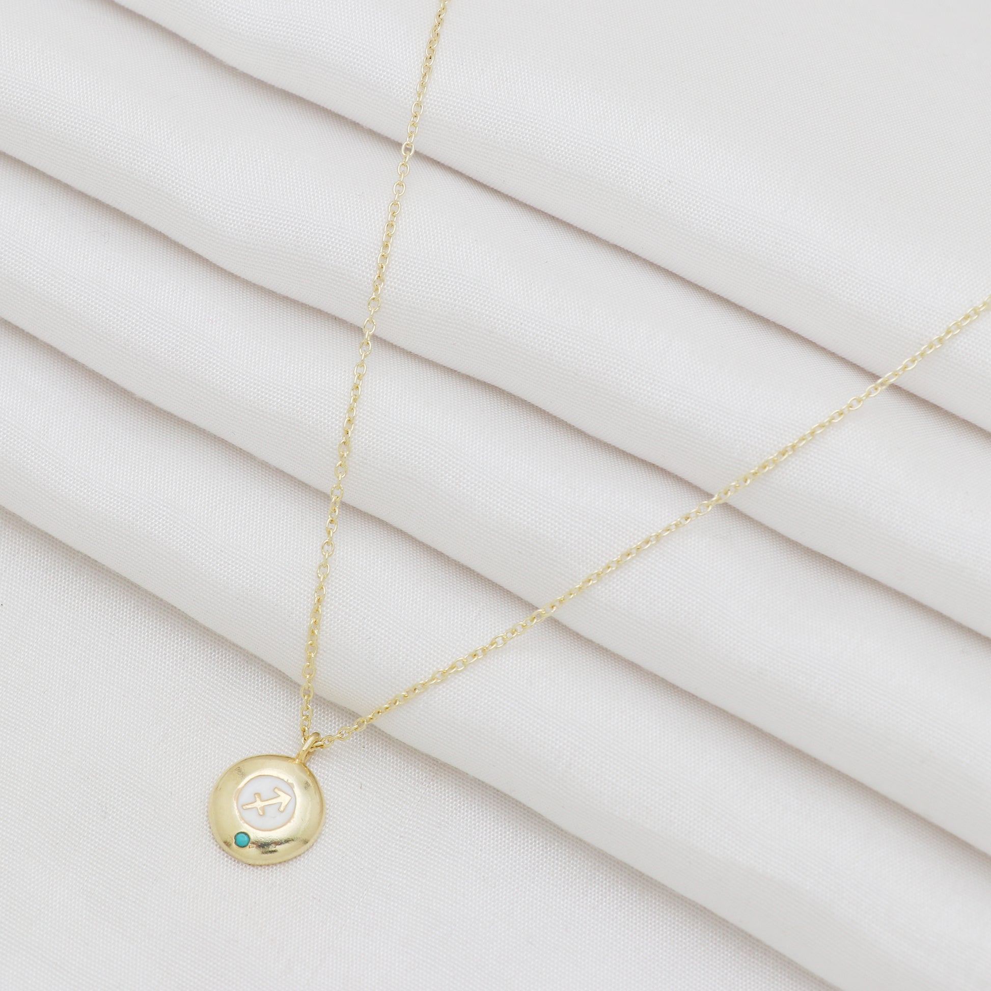 Embrace your inner adventurer with our Sagittarius Zodiac Sign necklace! Crafted with white enamel and a Turquoise as birthstone, set in Brass or 925 Sterling Silver with gold plating this necklace will ignite your sense of wanderlust. Let the stars guide you on your journey with this celestial and stunning necklace. Perfect for any zodiac enthusiast born between November 22 - December 21.